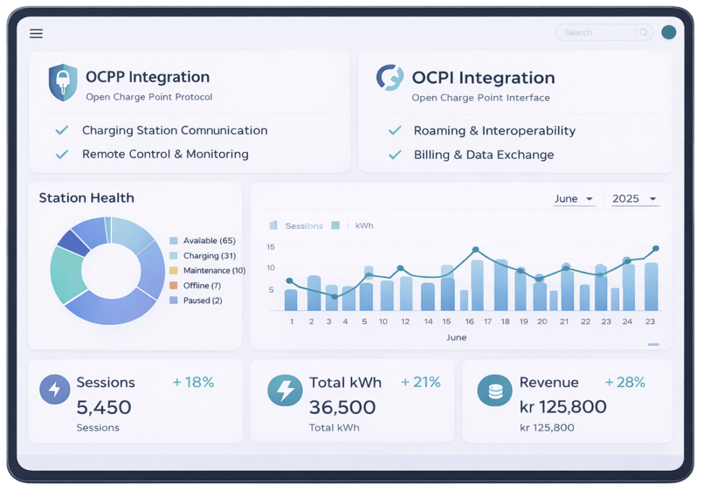 Maximera flexibiliteten utan att överge de system ni idag redan använder. Vår molnbaserade lösning kommunicerar via standardprotokoll som OCPP och OCPI. Det innebär att ni kan lägga till dom senaste betalfunktionerna parallellt med era nuvarande administrationsverktyg utan komplicerade konfigurationsprocesser.