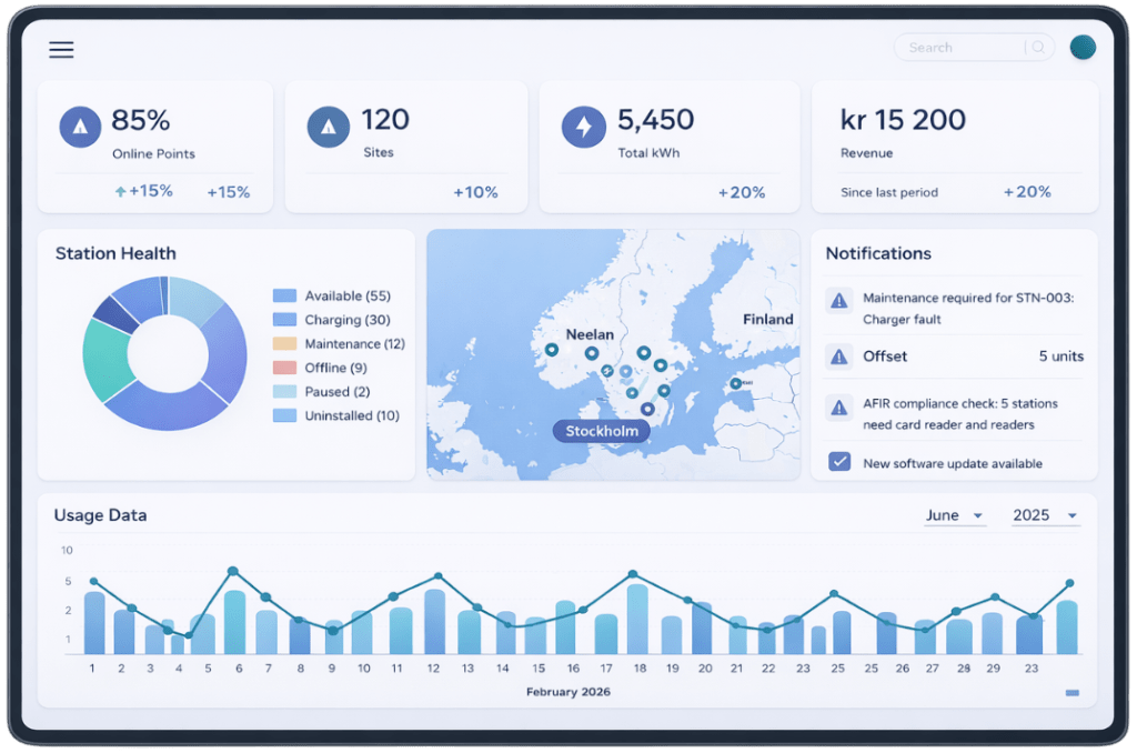 Vi erbjuder med ChargeSystem en SaaS-plattform kopplad till AI som gör det enkelt för både operatörer och fordonsägare att hantera laddning av elfordon. Genom att kombinera smart mjukvara med kopplingar till marknadens mest konkurrenskraftiga finaslösningar skapar vi en användarvänlig upplevelse som ökar lönsamheten och stärker kundrelationen vid varje laddtillfälle.